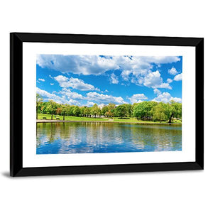 A photorealistic landscape of a pond at the National Mall in Washington, with park trees, benches and clouds reflected in the water. The scene reads peaceful, serene and bright, rendered in blues, greens, white and brown. Suited to modern home interiors and general room decor.