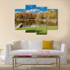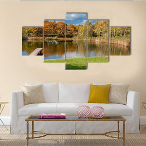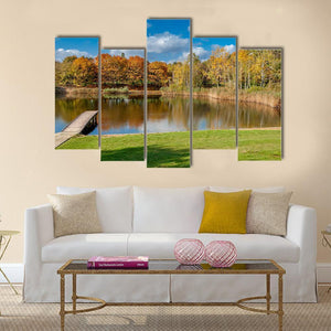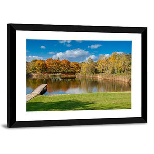 A realistic landscape of a pond and wooden pier in Szczesliwice Park, Warsaw, with colorful autumn trees reflected on the water. Calm and vibrant at once, the print brings a peaceful, natural mood that fits modern home walls and living spaces.