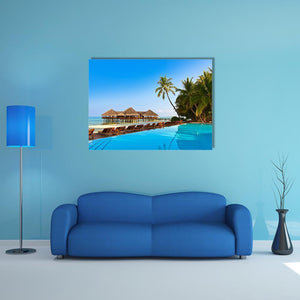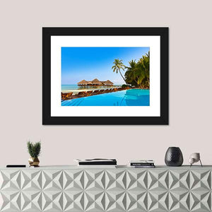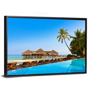 This photorealistic canvas art captures the serene beauty of a tropical resort in the Maldives, featuring an inviting infinity pool and elegant overwater bungalows. The relaxing atmosphere, framed by lush palm trees and a stunning ocean view, adds a touch of luxury to any space.