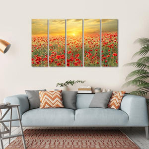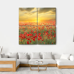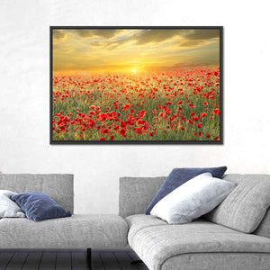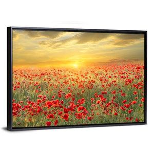 This canvas art captures a serene field of poppies basking in the warm glow of a sunset. The vibrant reds and greens create a peaceful atmosphere, making it a beautiful addition to nature-inspired décor.