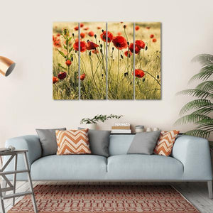 This canvas art features vibrant red poppies blooming amidst tall golden grass, capturing a peaceful, sunny summer day. Its vibrant colors and depth create an inviting atmosphere, perfect for nature lovers seeking to enhance their living space.