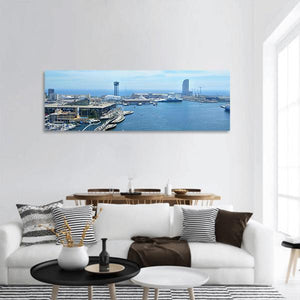 A panoramic canvas of Port Vell and Maremagnum in Barcelona, photographed from a high angle to show the harbor, boats, modern buildings, and a tall tower beneath a bright blue sky. The realistic, photographic print balances bustling daytime activity with a calm, seaside mood. Suits modern or coastal room decor, such as living rooms and home offices.