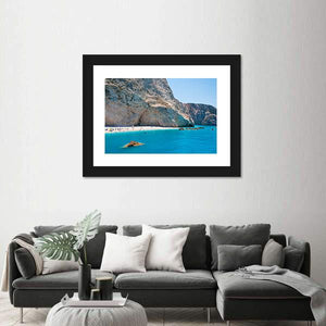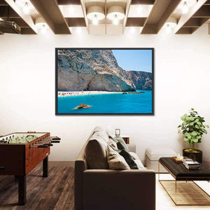 Porto Katsiki Beach Canvas Wall Art shows a wide-angle, sunlit beach scene with cliffs, a rock formation, boats on the water, and people on the sand. The photographic, realistic print leans on blues, whites, tans, and greens to create a serene, relaxing, vacation-like mood; it works well in coastal or modern living rooms and bedrooms.