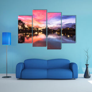 A photographic landscape of Bangkok’s Public Parkland Suan Luang R 9 at sunset, showing water, sky and a building reflected in the lake. The image highlights a building with a spire, trees lining the water and colorful pink, blue, purple and orange tones with lights mirrored on the surface in a symmetrical composition. The scene feels serene yet dramatic and suits modern living rooms or contemporary office walls.