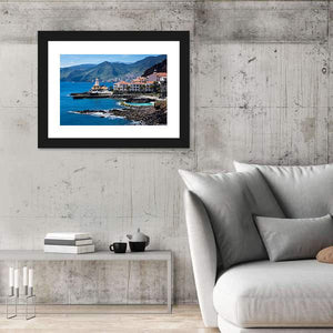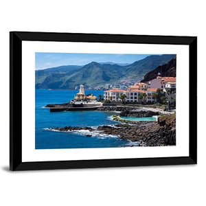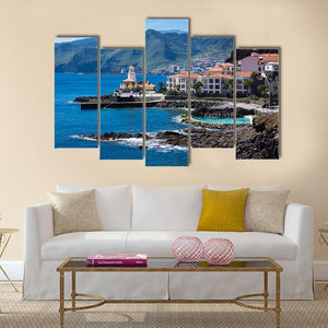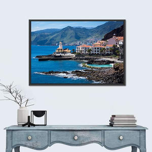 A realistic landscape canvas showing a coastal town with a lighthouse, clear water, rocky coastline and tiered buildings. The vibrant blue, green and white palette creates a scenic, serene mood that suits coastal or modern room decor.
