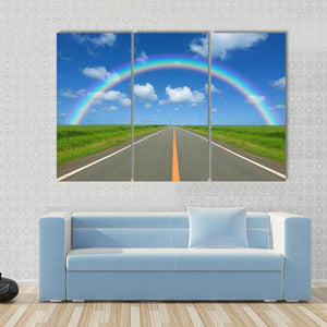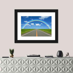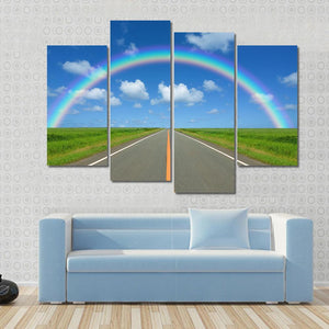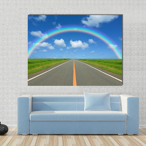This vibrant canvas art features a serene landscape with a radiant rainbow arched over a straight road. Perfect for adding a hopeful touch to your space, it captures the beauty of nature with a blend of blue, green, and fluffy white clouds.
