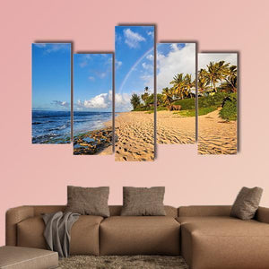 A photorealistic beach scene showing a rainbow over a popular surfing beach with palm trees, ocean, wet sand and tide pools. The composition uses depth and perspective to highlight lush greenery and a serene, tropical atmosphere. Suited to coastal, modern, or casual living spaces and bedrooms as room decor.