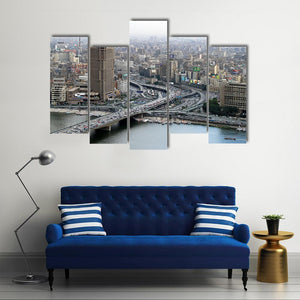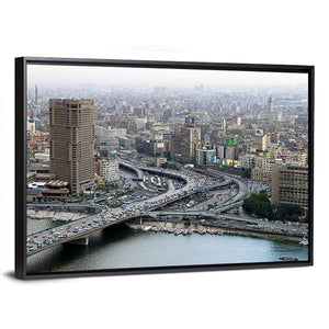 This canvas art captures a vibrant cityscape featuring the Ramses Hilton Hotel along the Nile River in Cairo. With a busy urban atmosphere framed by grays and blues, it highlights the dynamic traffic on the bridge against an overcast sky.