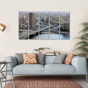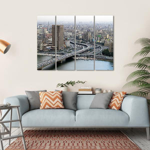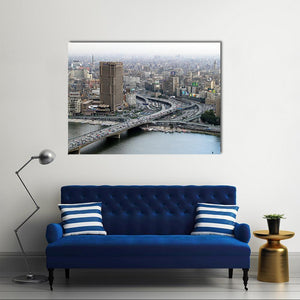Capture the lively essence of Cairo with this canvas art featuring the Ramses Hilton Hotel and the bustling Nile River. The piece showcases a busy city skyline, characterized by tall buildings and a multi-lane highway bridge, all rendered in realistic detail. It brings a sophisticated touch to urban-themed decor.
