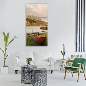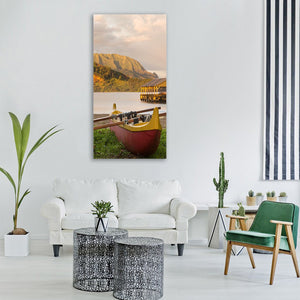 This captivating vertical canvas features an outrigger canoe with a vibrant red hull and yellow trim, set against a serene beach backdrop. The warm light filtering through an overcast sky enhances the peaceful atmosphere, making it a perfect addition to your nature-inspired decor.