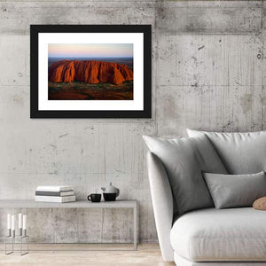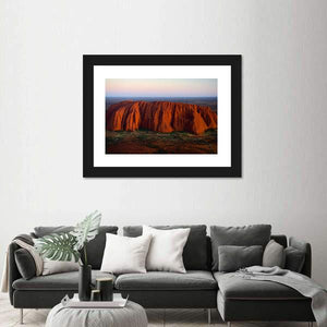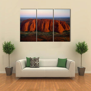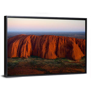 Red Monolith Canvas Wall Art shows Uluru rising from the Australian Outback in a wide aerial view. Warm reds and oranges meet green and blue tones beneath a pink-and-blue gradient sky, giving a serene, majestic, natural mood. Suits modern homes and living rooms as a calm focal piece.