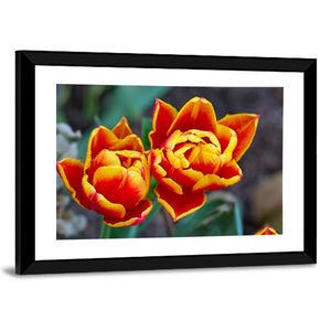This canvas features a stunning close-up of two red and yellow tulips, capturing their vibrant and delicate beauty. The natural tones of green and brown enhance the floral scene, making it a perfect addition to brighten any space.