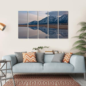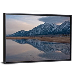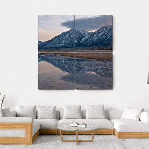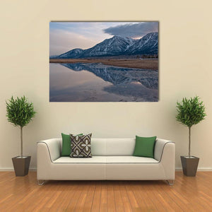 This canvas wall art captures a serene landscape featuring the majestic Jobs Peak set against a tranquil lake. The beautiful reflections of the snow-capped mountains and sky create a calming atmosphere, perfect for any space seeking a touch of nature's beauty.