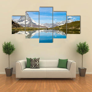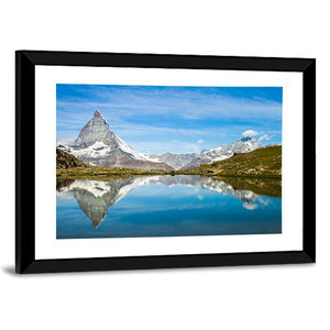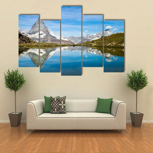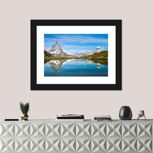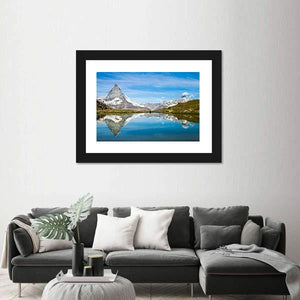 A photographic canvas print of the Matterhorn rising above a clear lake, its snow-capped peak mirrored in calm water. The symmetrical composition and blue, white and green palette create a serene, majestic mood that fits modern living rooms and bedrooms.
