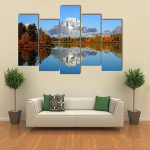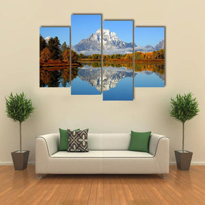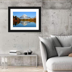A nature photograph of a snow-capped mountain mirrored in a calm lake, with autumn trees along the shore. Symmetrical composition and a blue, white, orange, and green palette create a serene, majestic mood that works well in modern living rooms or bedrooms.