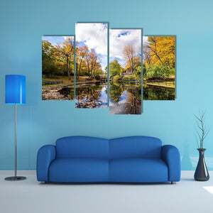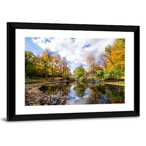 Reflection Of Trees In A Small Lake depicts trees, a small pond with fallen leaves, a simple bridge and a partially obscured house framed by autumn foliage. The scene feels peaceful and vibrant, with warm yellows and oranges balanced by greens and blues. It suits rustic or nature-inspired rooms and works well as room decor or modern canvas art.