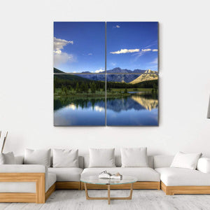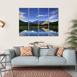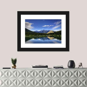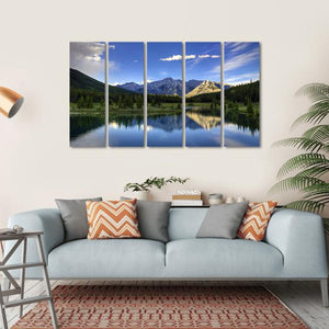 This canvas wall art captures the serene beauty of Banff National Park, featuring tranquil reflections in the water of a picturesque lake surrounded by majestic mountains and lush forests. The composition highlights depth and symmetry, inviting calmness into any space.
