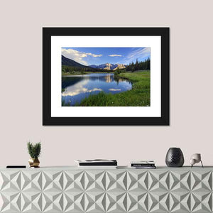 Reflections Into Cascade Ponds captures a serene lake scene with mountains, tall pine trees, and cumulus clouds mirrored in calm water. Its blue-and-green palette and rule-of-thirds composition bring a peaceful, natural feel that suits rustic or nature-inspired rooms and modern living spaces.