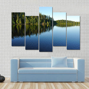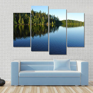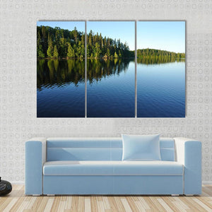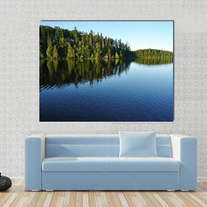 This canvas art captures the serene beauty of a coniferous forest reflected in a tranquil lake. The realistic portrayal of blue skies and dense green trees evokes a calm and natural atmosphere.