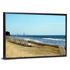 Relax on the beach of Cartagena de Indias — a realistic coastal landscape that shows a row of lounge chairs, calm turquoise water, and a distant city skyline. The scene reads peaceful and serene, a quiet focal point for modern living rooms or coastal-themed spaces.