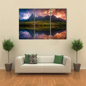 This canvas depicts terraced rice fields with Mount Fansipan rising beyond a reflective lake under a stormy evening sky. Realistic colors — deep blues, purples and orange sunset tones with greens and browns — give the scene a dramatic, serene and majestic feel that suits modern or nature-themed room decor.