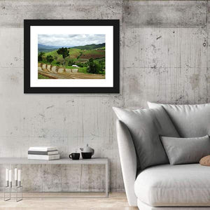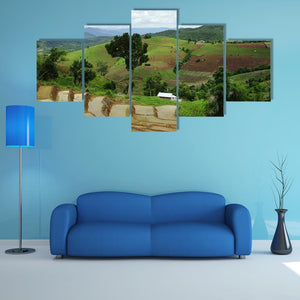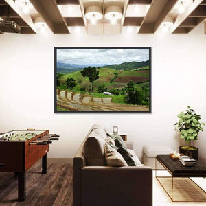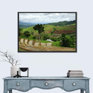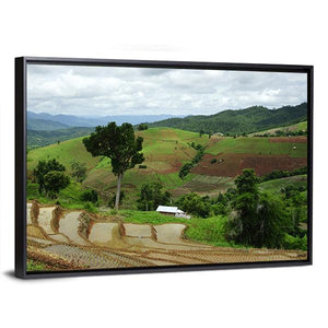 Rice terrace at Maechaem in Thailand captures tiered paddy fields, rolling hills, scattered trees and a small building in a realistic landscape. The scene reads serene and rural, with greens, browns, blues and reflective water in the paddies. It pairs nicely with natural or modern interiors as a calm wall accent.