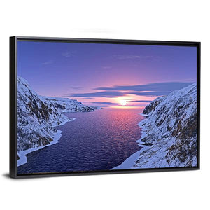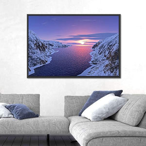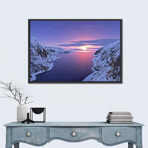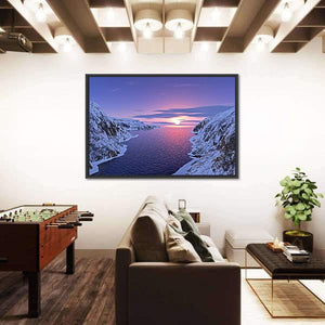 River Among Snow Bound Mountains at Sunset Canvas Wall Art