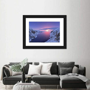 This canvas wall art captures a serene landscape of a river winding through snow-covered mountains during sunset. The soft hues of purple, pink, and blue create a peaceful atmosphere, making it a beautiful addition to any room decor.
