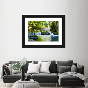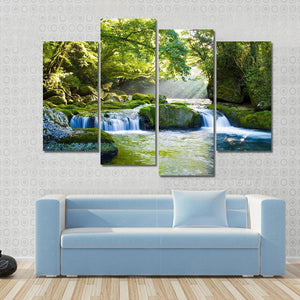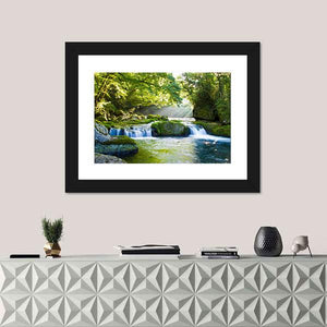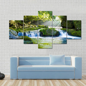 This landscape artwork captures a serene river flowing through a lush forest, illuminated by sunlight filtering through the trees. Its natural and peaceful vibe makes it a lovely addition to any room.