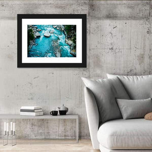River Ganga In Valley Canvas Wall Art captures the Ganga flowing through a rocky valley from an overhead view, with turbulent water rushing around large boulders. The blue, grey, green, and white palette creates a vibrant, dynamic, natural mood that fits modern or nature-themed interiors as room decor.