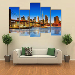 New York's Brooklyn Bridge and Manhattan skyline glow along the East River, with city lights reflected in the water. The blue, yellow and orange palette creates a vibrant, energetic urban mood. Suited to modern living rooms and offices that favor contemporary cityscapes.