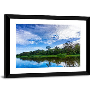 A panoramic view of a river winding through the Amazon rain forest, with trees, sky and clouds reflected in the water. The realistic scene uses blues, greens and whites to create a serene, natural atmosphere. It fits well in modern, nature-inspired rooms like living rooms or bedrooms.