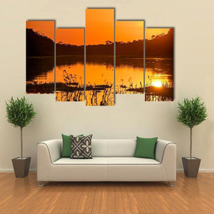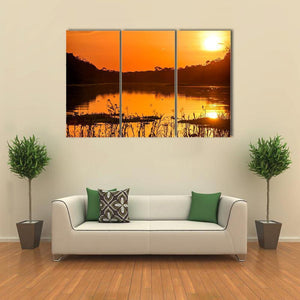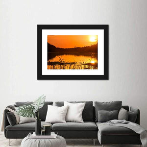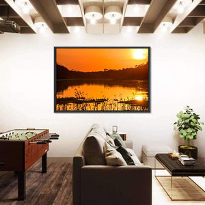 A landscape canvas depicting the river in the Amazon rainforest at dusk, with the sun visible as a warm orange glow over calm water. Reeds in the foreground and a treeline silhouette reflecting on the surface create a serene, peaceful mood that suits modern living rooms or bedrooms.