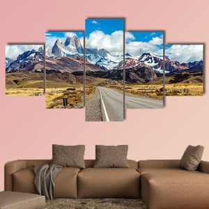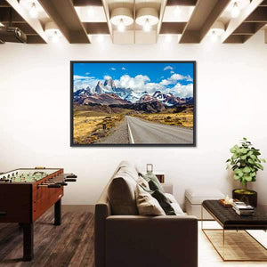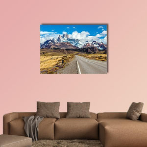 A realistic landscape of a paved road leading toward Fitz Roy Peak, with golden grass in the foreground and snow-capped peaks beneath a blue sky with clouds. The scene feels expansive and natural, a scenic focal point that works well in modern living rooms and entryways.