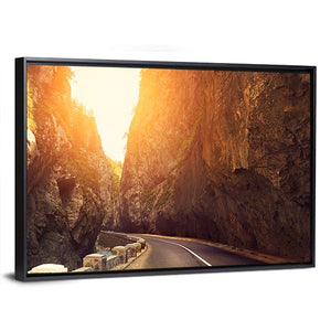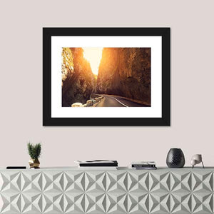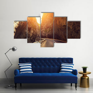 Road Passing Between Mountains shows a winding road cutting through rocky canyon walls with sunlight and a sun flare. The earthy palette of yellow, brown, green and grey creates an epic, serene, adventurous mood that fits modern or rustic rooms in a house.