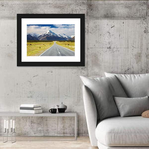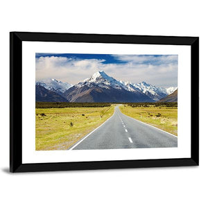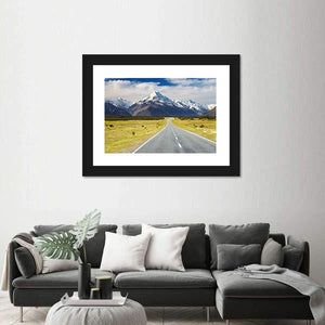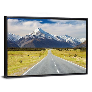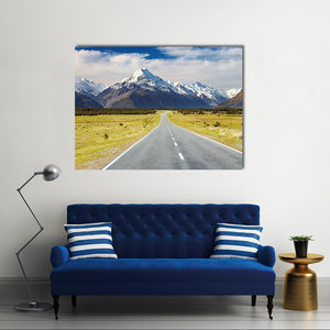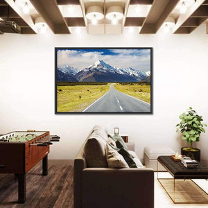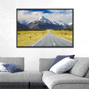 This captivating canvas features a scenic mountain road leading to snowy mountains under fluffy clouds. The serene and adventurous atmosphere combined with a beautiful palette of blue, white, green, and gray makes it a striking addition to any space.