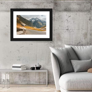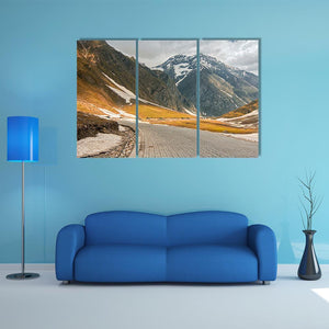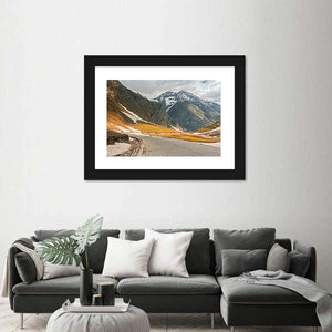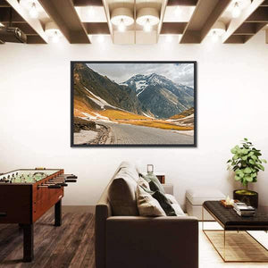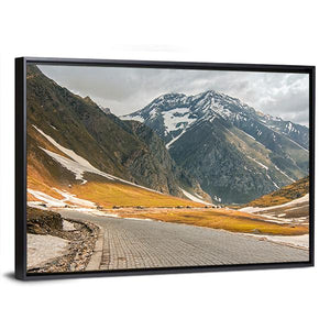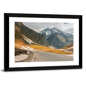 A wide-angle landscape showing a paved road winding up toward high Himalayan peaks, with patches of snow, rocky summits and an overcast sky. Rendered in a realistic nature‑photography style with blue, grey, brown and green tones, it creates a serene, majestic and adventurous mood that suits modern living rooms or nature‑themed spaces.