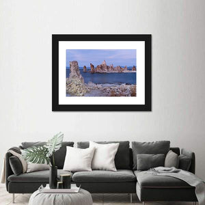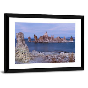 This canvas art captures the serene beauty of Mono Lake, showcasing tall, jagged tufa formations against a tranquil lake and a pale twilight sky. With its calming palette of blue, grey, and brown, it's a perfect addition to any nature-inspired decor.