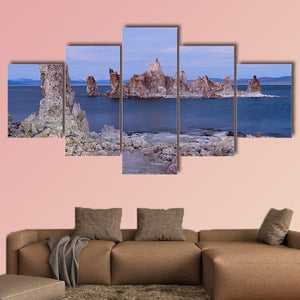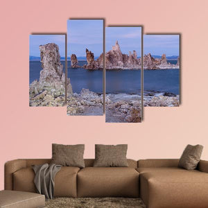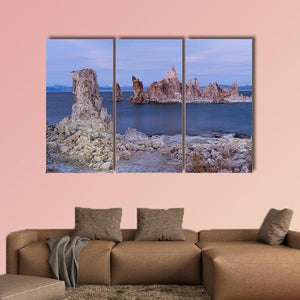 Realistic nature photograph of tufa towers along the shoreline of Mono Lake, California. Soft blues, grays and pinks capture a serene twilight over calm water, creating a quiet, natural mood that suits living rooms and nature-themed spaces.