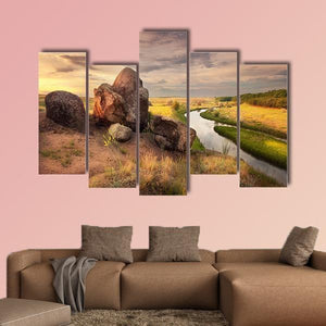Rocks And River With Reflection In Ukraine shows a serene riverscape with large foreground rocks, a winding river and dramatic clouds. The natural brown, green, yellow, grey and blue palette gives a peaceful, rustic feel that suits modern or rustic home decor.