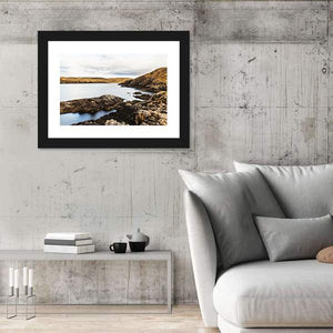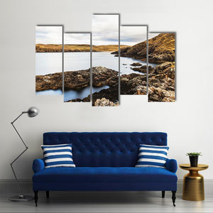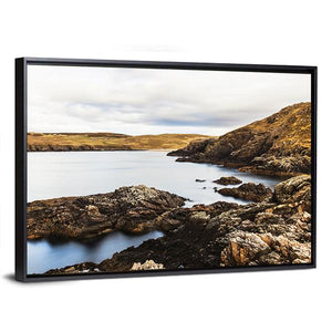 This landscape canvas features a rocky coastline with calm waters and rolling hills. The serene palette of blue, brown, and gray captures a natural atmosphere, perfect for those seeking a touch of tranquility in their decor.