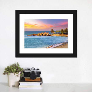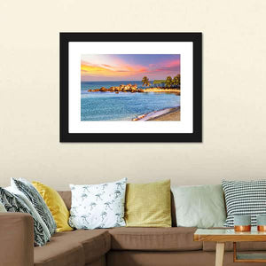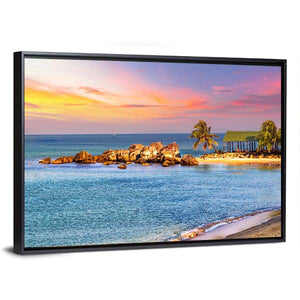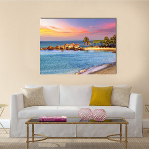 A realistic sunrise scene of a tropical beach, where soft orange and pink skies meet blue ocean tones. Palm trees, a small open-air hut and a rocky outcropping sit above gentle waves, creating a tranquil, vibrant mood that fits coastal or modern room decor.