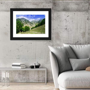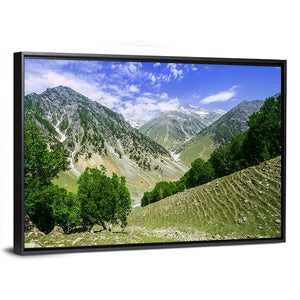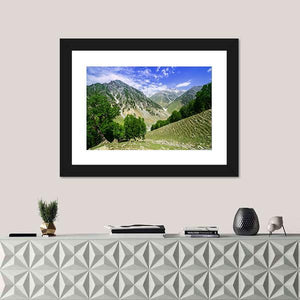 This canvas depicts a wide-shot mountain range with rocky slopes, a valley of green trees and a cloudy sky, capturing a serene and vast natural vibe. The green, blue, white and grey palette emphasizes a calm, nature-focused atmosphere that works well in homes and modern living spaces.