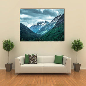 Rocky Mountains on the Alaska British Columbia border shows a mountain valley framed by snow-capped peaks and dense forest. Stormy clouds and a cool palette of blue, green, grey, and white give the scene a dramatic yet serene feel. Its modern composition and sense of depth suit contemporary home decor and room settings.