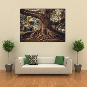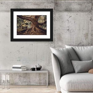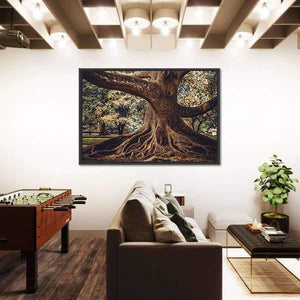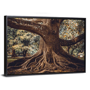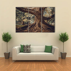 Root Of The Tree In The Forest shows a close-up of a banyan tree with massive exposed roots and textured bark among lush foliage. The brown, green and tan palette creates a serene, natural, almost ancient mood that pairs well with rustic or modern rooms. Use it as a quiet focal point in living rooms, entryways, or nature-themed spaces.