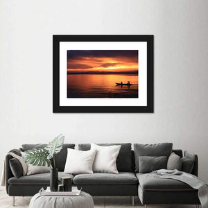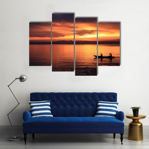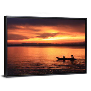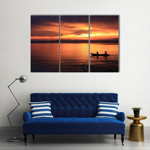 Rower At Sunset Canvas Wall Art depicts a rower and kayakers gliding across calm water at sunset, rendered in orange, purple, blue and yellow tones. The scene feels serene and quietly romantic and works well with modern home wall decor.
