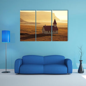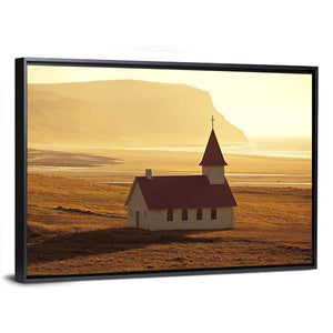 This canvas art features a serene Icelandic church nestled between the mountains and ocean. With a warm palette of gold, brown, and blue, it brings a peaceful atmosphere to any space.