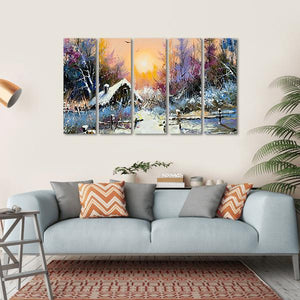 This captivating canvas features a snowy cottage surrounded by winter trees, illuminated by a serene setting sun. The rich palette of orange, purple, and blue brings warmth to the chilly scene, creating a peaceful ambiance perfect for any room.