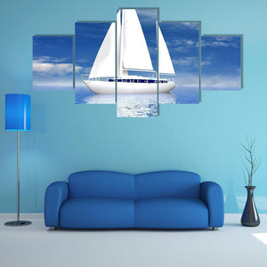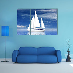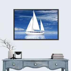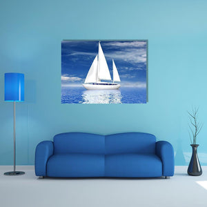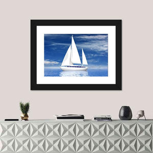 A realistic sailboat scene showing two white sails gliding across a calm blue ocean beneath soft gray and white clouds. The rule-of-thirds composition and gentle reflection on the water create a peaceful, serene mood that suits modern home and room decor.