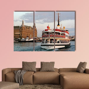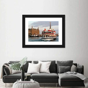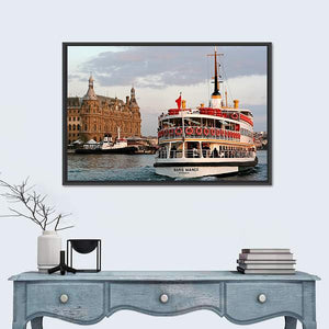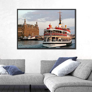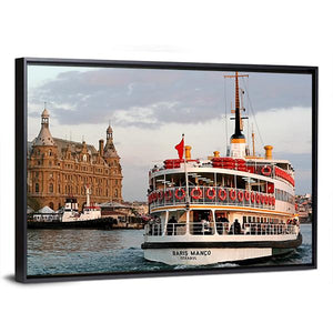 This realistic cityscape captures a passenger ferry—marked “BARIS MANCO”—moving toward the Haydarpasa waterfront with a towered building rising behind it. The blue, brown, white and gray palette creates a calm, scenic travel mood. Works well as understated wall decor in modern or travel-themed rooms.